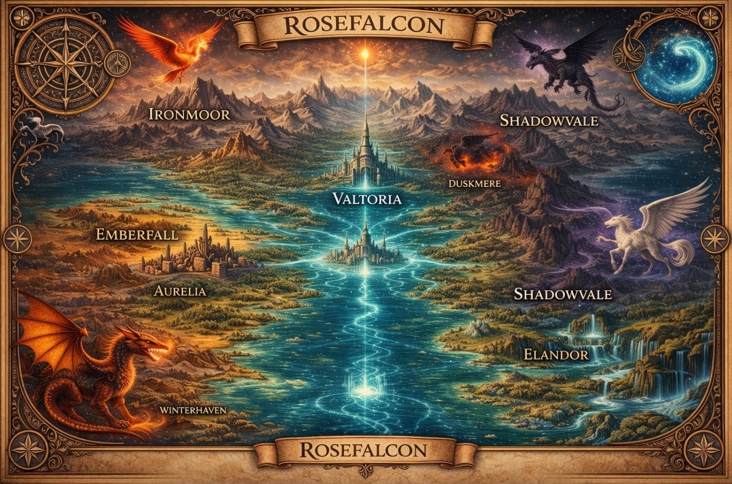 Rosefalcon and the Sacred Nexus are separate realms, but together they form the beating heart of the Sterling Scrolls universe—two worlds joined by echoing wars, perilous magic, and romances that refuse to fade.